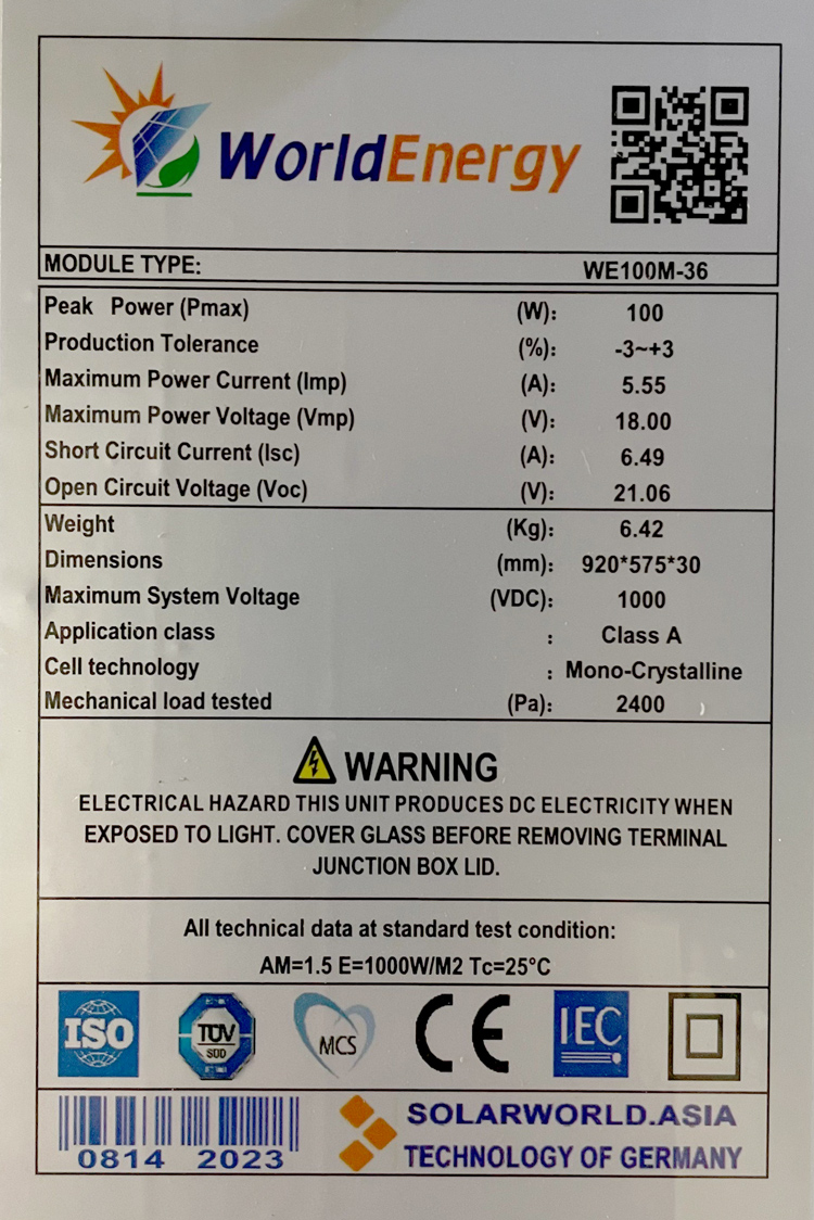 Thông số kỹ thuật TẤM PIN NĂNG LƯỢNG MẶT TRỜI MONO 100W WORLD ENERGY