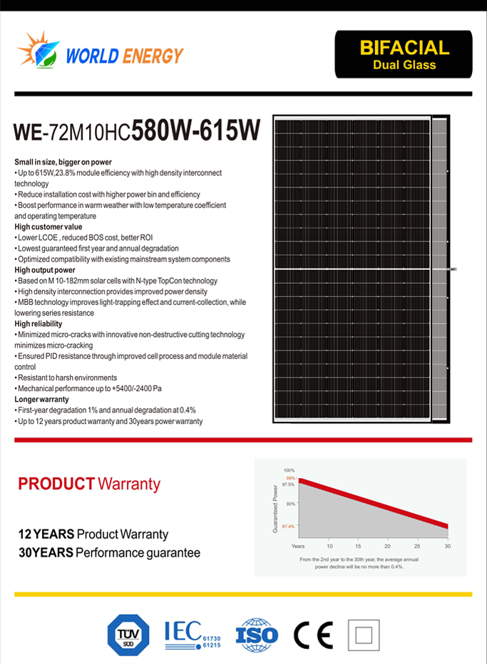 Tấm Pin Năng Lượng Mặt Trời World Energy 595W – Viền Đen Hai Mặt Kính (WE-72M10HC595W)